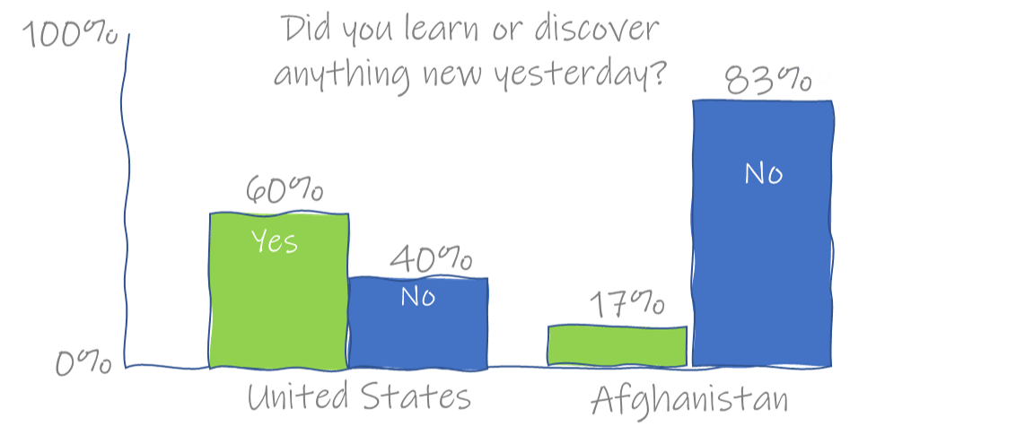 As evidence, the Gallup World Happiness Report suggests one of the key indicators of happiness around the world is whether someone learned or discovered something new yesterday. Today, only 60% of the U.S. population claims to have learned something new the previous day. That seems impossible given the amount of information at our fingertips. Compared with, say, Afghanistan where only 17% of people learn something new each day. Okay, Afghanistan really has nothing to do with the story. Can I take that back?