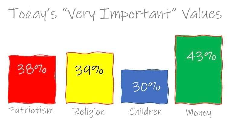 So, if we are looking for the message here, it is this: Americans now feel that money is more important than patriotism, more important than developing a faith life, and more important than growing deep friendships or having children. (And we wonder why we get unhappier every year as a country.)