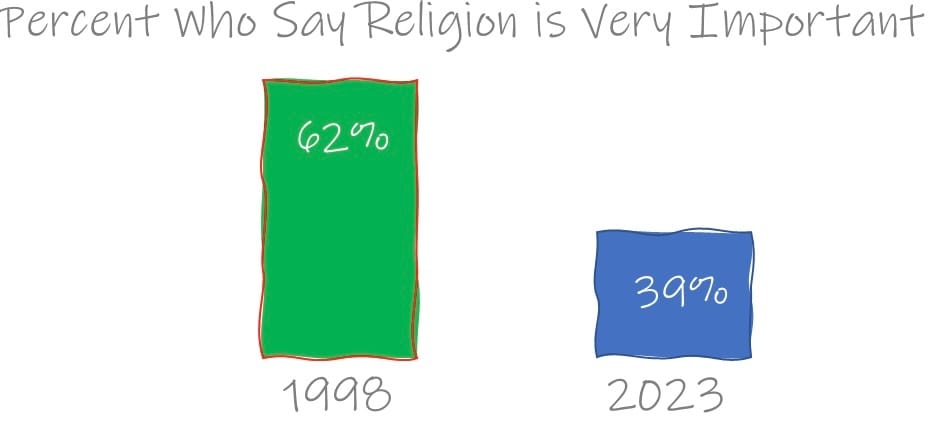 Twenty-five years ago, 62% of people felt that religion was very important. Today, that number is only 39%.