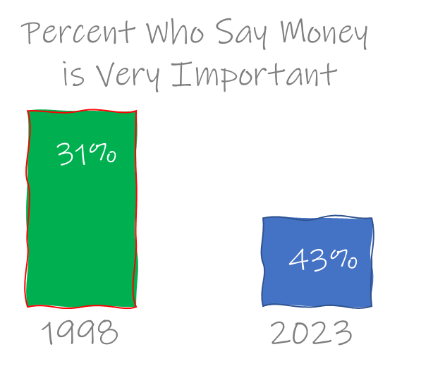 In stark contrast to these surprising mega-trends, there is one thing that seems to be skyrocketing in popularity. A shocking 43% now describe money as very important compared to 31% in 1998.
