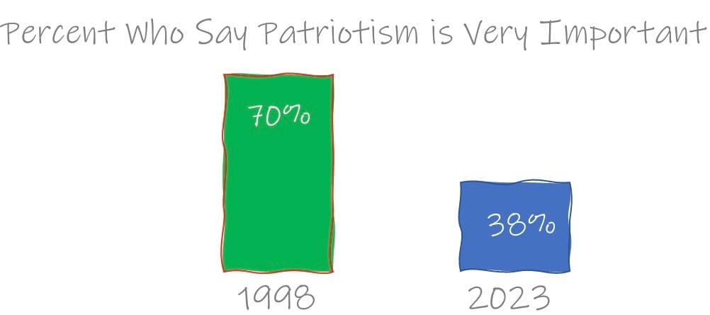 Today, only 38% of Americans say that patriotism is very important to them. That’s down from 70% in 1998. Now, I think we can agree that the term “patriotism” has become politicized. I wonder if this change of heart has more to do with our overall happiness than with politics.