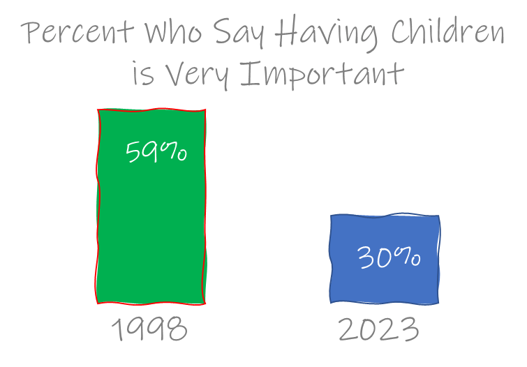 Even having children is no longer a priority. I wrote about that in a piece called The Birth Rate is Crashing. Should We Worry? The percentage of Americans who believe having children is very important has fallen to 30% in a new poll. Twenty-five years ago it was 59%.