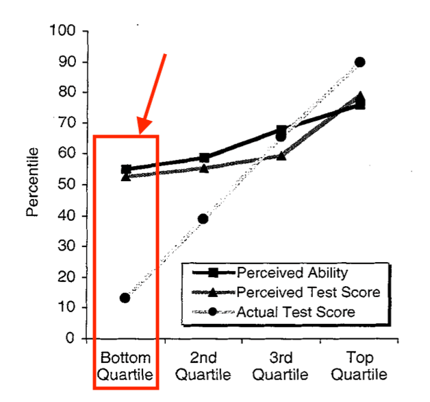 As the graphic below illustrates, people with the highest perceived ability and test scores {orange rectangle} tend to perform in the bottom quartile.