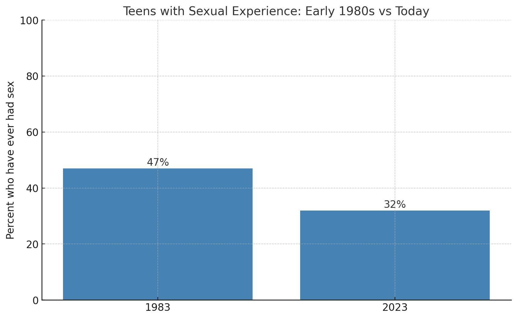The number of teens having a sexual experience has also dropped precipitously. I’m not encouraging or condoning teen sex. I’m just making a point about risk. The number of teens having a sexual experience has dropped to 32% since 1983. Maybe because they don’t have a car or a backseat.