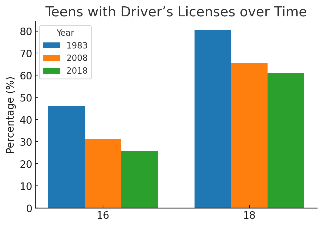 Today’s teens have little interest in driving. The number of sixteen year old drivers has fallen 45% since 1983. I can’t imagine delaying my driver’s license at age 16.