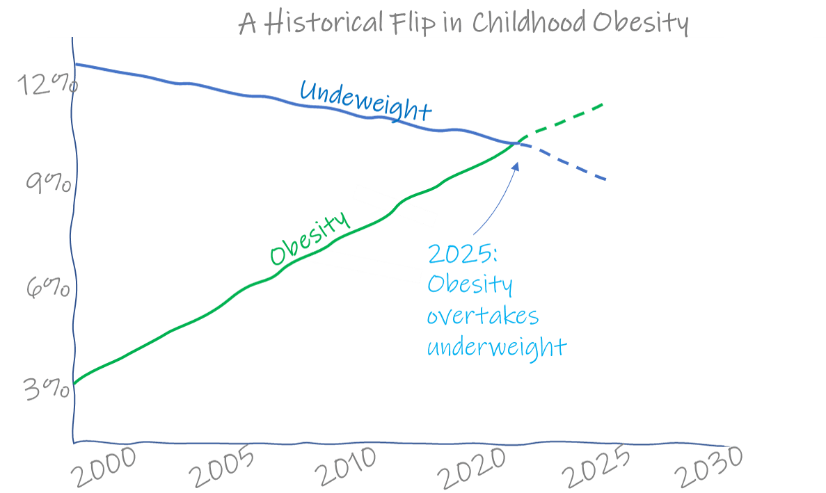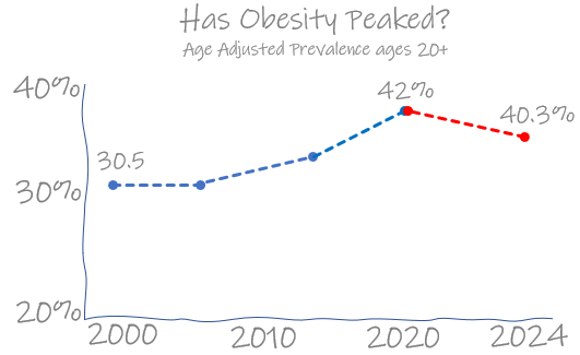 Today we have options to help quell the impact of all those late night runs to Taco Bell. Newly available GLP-1’s are an expensive weight-loss prescription drug that dramatically alters our internal circuitry: reducing hunger and demand and desire for food. For the first time in 20 years the obesity rate in the US is going in the right direction.