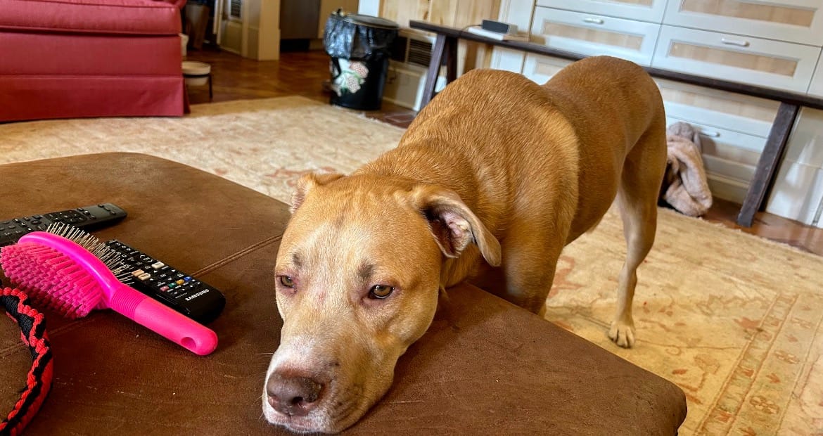 He doesn’t need a better yard, a better house, a better bowl, or a better humans before he allows himself to be happy. He is fully committed to enjoying the life he already has.